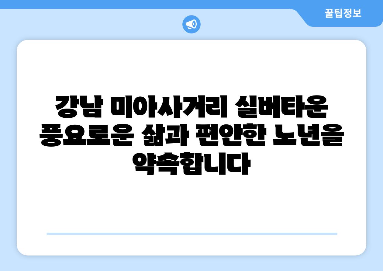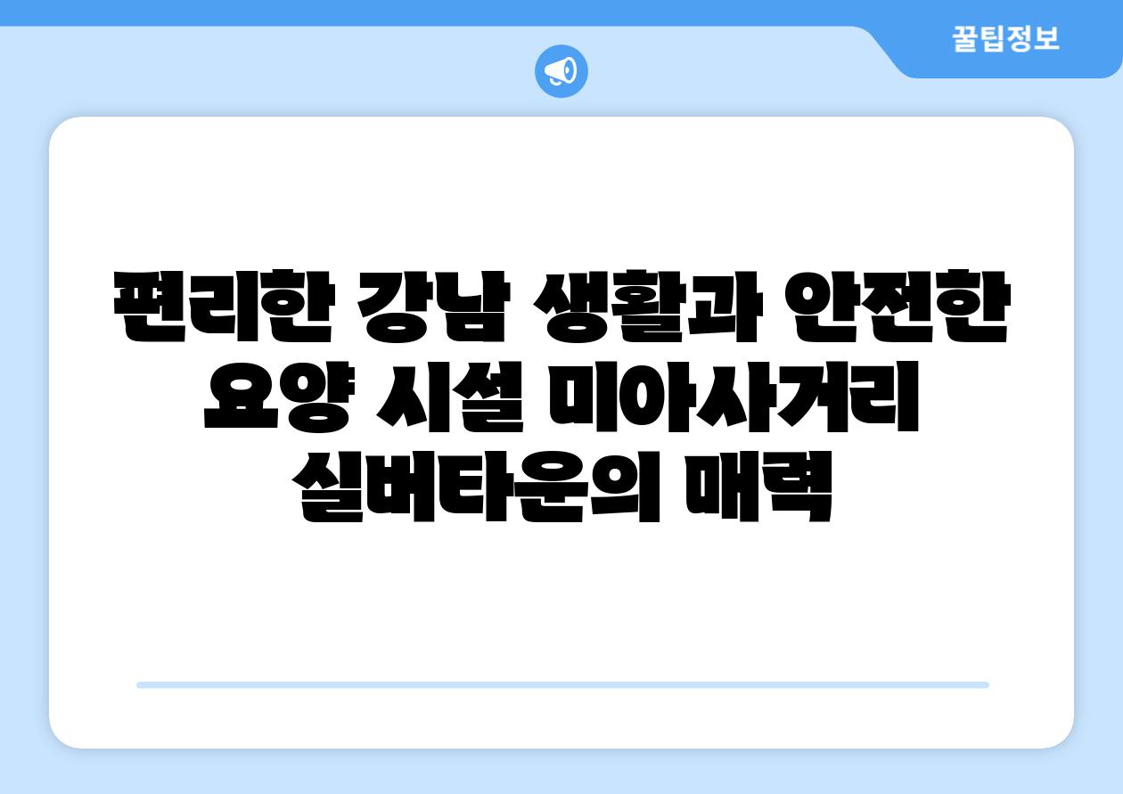 답변. 강남 실버타운 미아사거리는 강남 지역의 중심에 위치하여 편리한 교통 접근성을 자랑합니다.